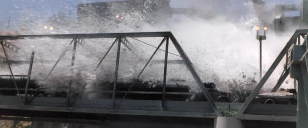 Tony leaps from the helicopter onto the roof of the train, narrowly misses having his head chopped off by a tunnel, and another, and finally he manages to shimmy down to Babyfat’s carriage where he knocks on her window waiting to be let in.