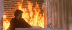 With that he turns the radio on, loud, and gets going on Mecenas. Or Mister Mecenas, as Tony corrects him. Even though he is facing Tony head-on, Schenk still manages to miss him with a direct shot. Then Tony hides under a glass table for protection and Schenk still manages to cock it all up – shooting at the table rather than the protruding parts of Tony’s body, causing bullets to ricochet around the room. Tony then stands up, using the glass table as a shield, Schenk again makes the same mistake repeatedly shooting at the table causing ricochets but no injuries whatsoever. Then the bullets run out and Schenk no longer has the advantage.