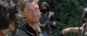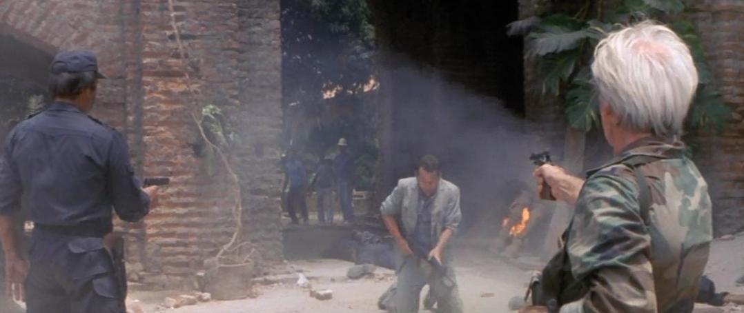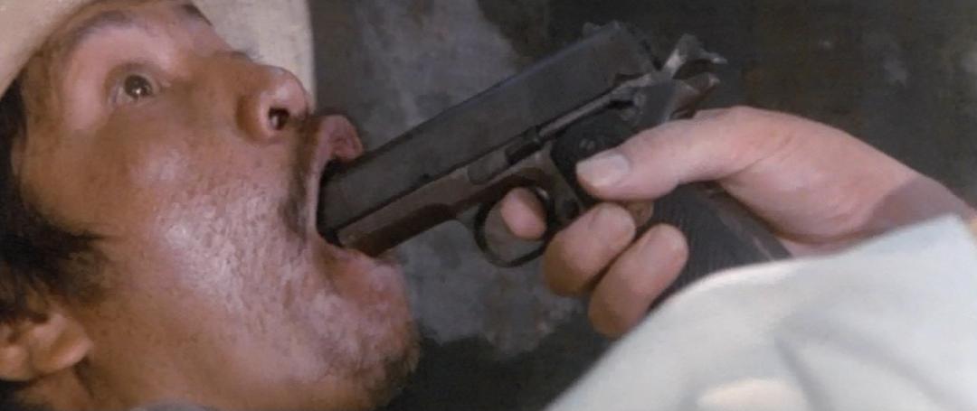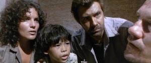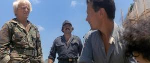 Suddenly a boat is approaching but it’s the Chinese gang, so Tony hides in the water with the case of cash and tells Babyfat and Pendergast to go aboard their boat. When the Chinese gang see it is Pendergast they are delighted, but their delight turns to disappointment when Tony surfaces with a gun and orders the Chinese gang onto the dinghy boat, taking their boat in return for a more speedy escape.