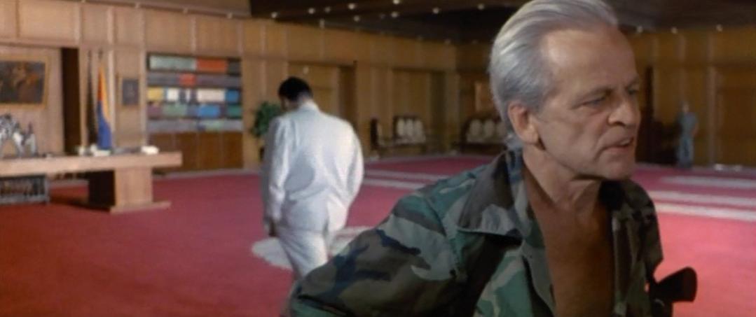 The mosque tower is where the second real piece of action takes place – Hansi tries to shoot Tony and they fight at the top of the tower, Hansi revealing his steel hand flick-knife attachment (curiously enough, a few years later in Enter the Dragon Bruce Lee also battled a villain called Han who sported a steel hand knife attachment):