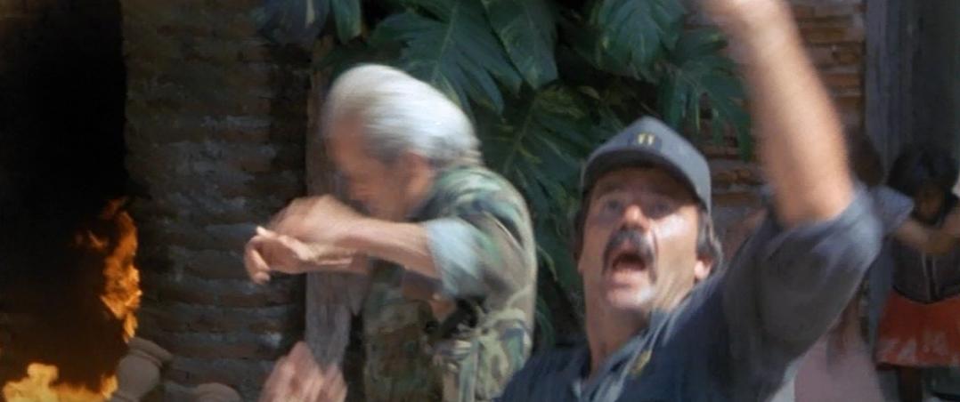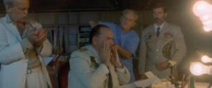 “Shore leave, boys – all over the side!”, Tony tells the gang, and then he starts shooting when they take no notice of his orders. Suddenly they take notice. Before demanding that the Captain follow suit, Tony asks him where the others are and, finding Babyfat and Pendergast below deck, he makes the Captain jump ship too.