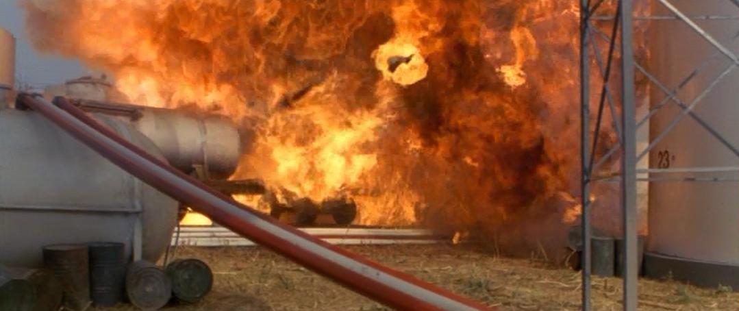 Tony sneaks off with Gunther’s wallet, dodging bullets as he goes, heading directly for an excavator which he drives straight at the gang, lifting up one of the cars with the scoop to throw it onto the other cars – then he drives off into the night doing up his tie.