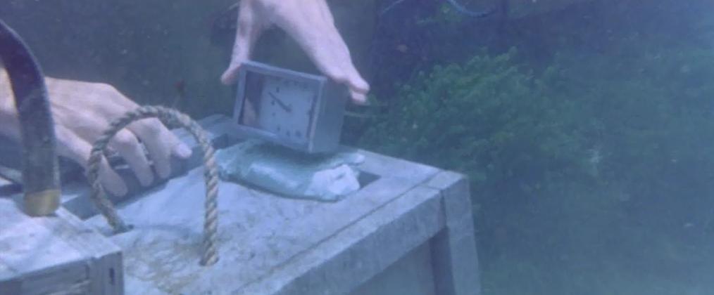 A crowd gathers around the pool, including at least a couple of policemen, who look on as Tony grapples with his attacker and eventually manages to force the guy’s knife into his own back. As Tony begins to surface he sees the policemen and heads straight back underwater, taking the breathing apparatus with him as he heads off out of the vent, coming up just a matter of a few feet away in a smaller water feature on the premises. He tries to make off undetected but he is spotted and has to leg it away from the hotel.
