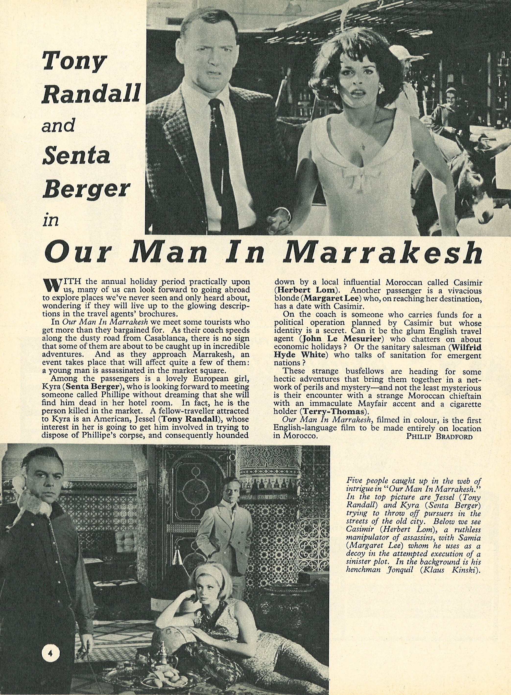 This is a review of Our Man in Marrakesh taken from the June 1966 edition of ABC Film Review. Klaus does not get a mention in the review, although there is a rather lovely photograph of him with his hands in his pockets (as ever), loitering in the background whilst Margaret Lee and Herbert Lom have a chat. Luckily I managed to find a lobby card set for this film too, also tinted, so here is the same photograph larger and in colour: