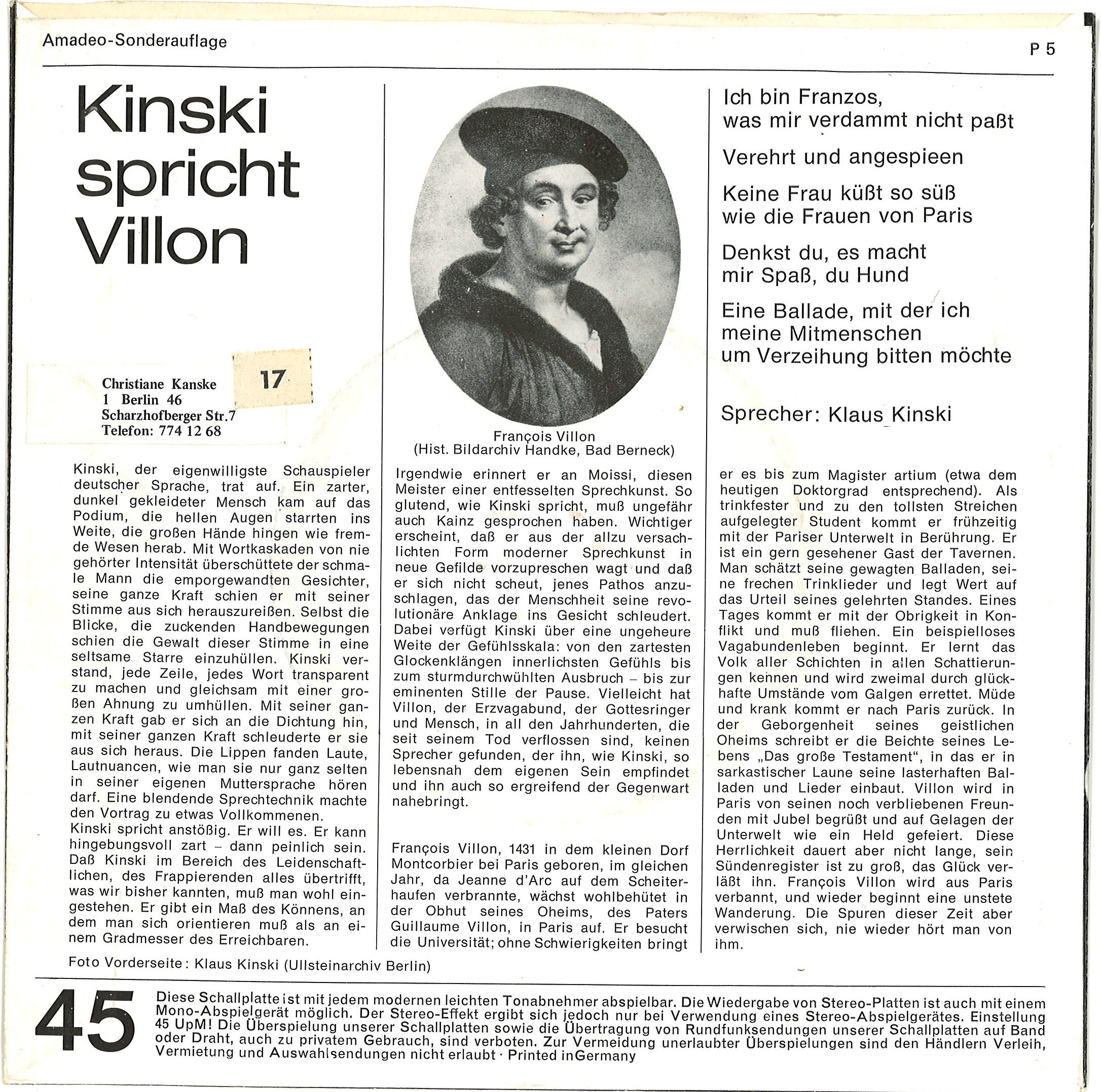 And, finally, when I went to Berlin for the first time last year, I went on a bit of a Kinski pilgrimage – photos and stories on that to follow. Whilst there I went record shopping – it’s the law, I just HAVE to – and I was so happy to find this lovely Kinski spricht Villon EP: