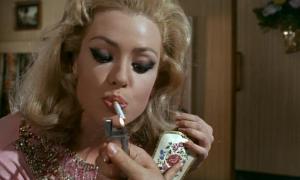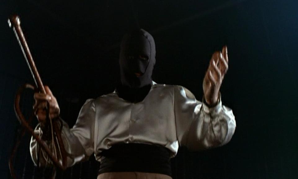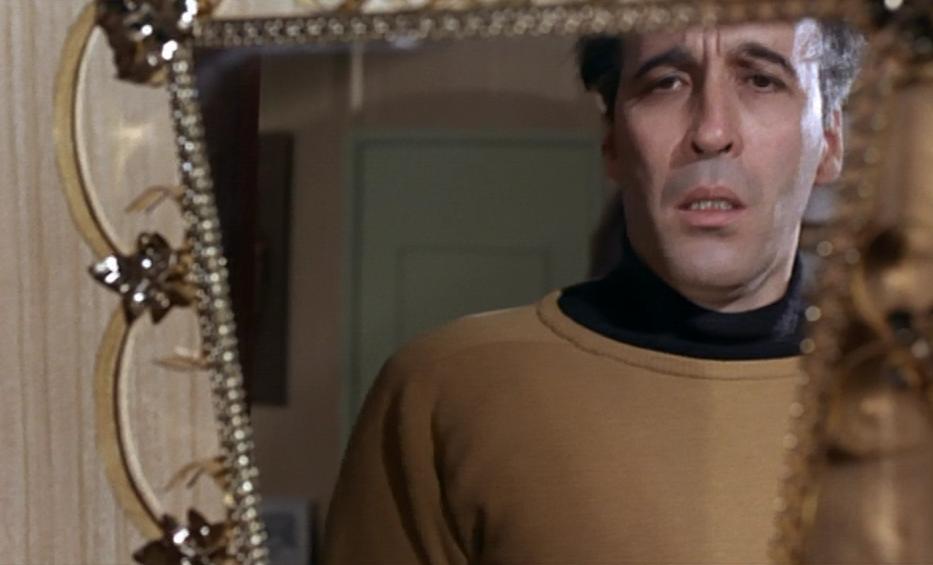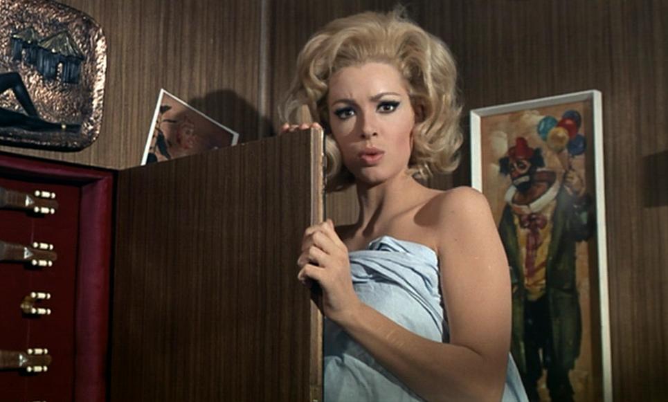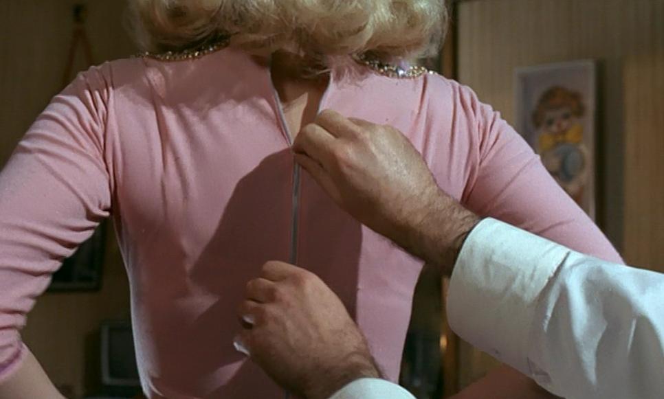 - The mystery man – the beautiful Gina (Margaret Lee) is having an affair with an unidentified character. The mystery man strokes her legs, helps her to fasten her leotard, lights her cigarette and not once does he speak or show his face. A great way to restrict our knowledge! He has a mirrored cabinet on the wall and this is full of knives with the silver triangle symbol on them. One of them is missing… he’s undoubtedly the murderer and the man who took the money, but who is he? All we know about this mystery man is that he is incredibly hairy on his arms and his back and he wears a white vest in bed!