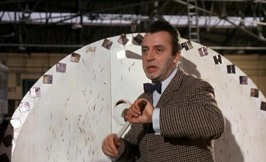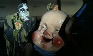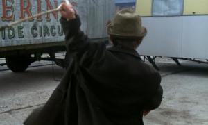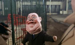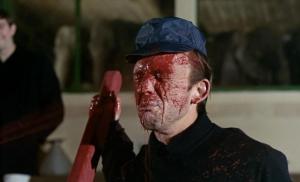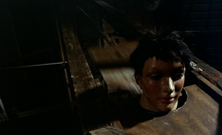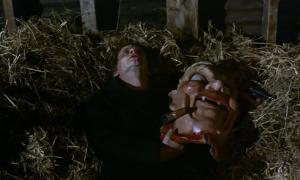 Another great moment is Manfred’s death – as he is stabbed in the chest, he falls over and as he does so he grabs one of the huge circus character heads and lands in the hay with the head next to him: