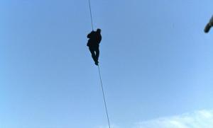 But the money has quickly been zipped down a wire from the bridge to a boat below and the gang have all descended to the boat in the same way, so other than the inju