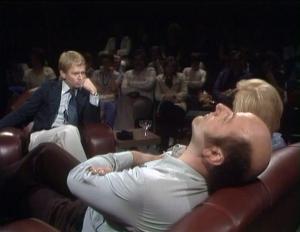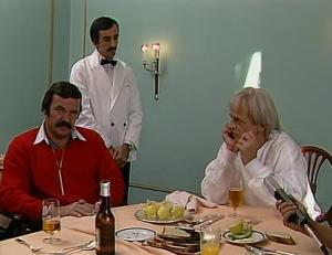 Anyway, what can I tell you? Klaus is in a hotel, eating a very big meal (I lose track of the number of courses throughout this 75 minute sort-of-interview-type-thingy), ignoring the beautiful Helga and directing his non-responses and naughty jokes to his friends who are (mostly) in the off screen space. First off, he makes a grab for Helga’s microphone that he seems to think is a bit sexual, which could explain why later in the interview he pretends to masturbate it; however, it does not explain why he tries to squeeze a lemon on it as well. The mind boggles…