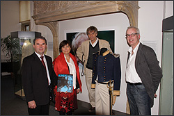 Photograph by Th. Hölscher: (from left to right) Director of the Museum Dr Lothar Hyss; Vera Pechel, designer of the Kinski book; Beat Presser; Klaus Kinski’s uniform from Cobra Verde and Dr Martin Steinkühler, the curator of the exhibition.