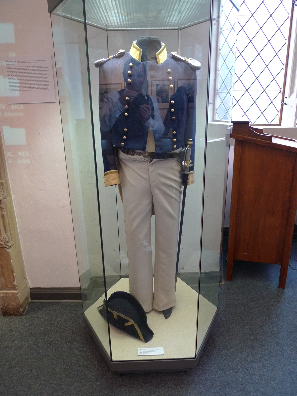Never let it be said that I don’t take my work on Du dumme Sau! seriously. On 21 July, I travelled all the way from London to Münster especially to catch the Klaus Kinski-Beat Presser exhibition at the Westpreußisches Landesmuseum. Because I’m organised (kind of!) I’d already pre-arranged to meet Beat Presser for an interview. When we arrived at the museum, which is in a lovely location on the outskirts of Münster, Beat Presser was busy being interviewed for German TV, so we (Dave and I) took the opportunity to look around the exhibition before anyone else arrived. We also met Dr. Martin Steinkühler, who was responsible for bringing the exhibition to the museum and who was incredibly welcoming to us. We got to see everything in peace and quiet before anyone else arrived: the many beautiful photographs and portraits Beat Presser had taken of Klaus Kinski and Werner Herzog (some impressively blown up to massive proportions); Klaus’ outfits from Fitzcarraldo and Cobra Verde; the selection of magazines with Kinski-Herzog movies on their covers; other items from the films… I particularly liked the “portrait” of Klaus and Claudia Cardinale from Fitzcarraldo.