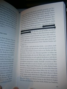 The sentence that was censored reads: “…sie teilten die Erfahrung von Einsamkeit und Selbstzweifel sowie eine geringschätzung des eigenen Körpers, eine Neigung dazu, sich andere zu verkaufen.” I asked Christian David if he was able to tell me anything about this and he kindly sent the following information: