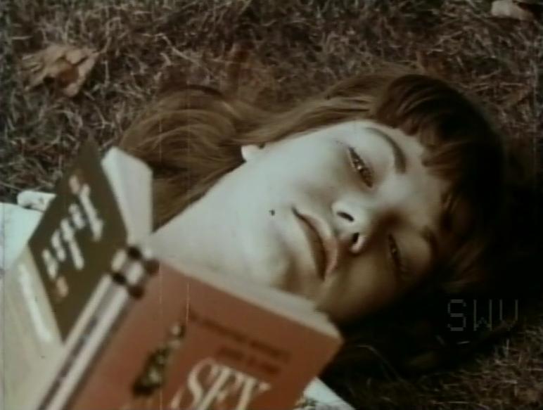 Lynn manages to escape the state troopers’ clutches without arrest, but now she has turned 17 and her baby belly is beginning to show. She worries about the baby having no father and decides that she should find a willing “university guy with brains.” She proposes to do this by hanging around the campus reading a book about sex.