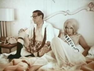 Anyway, the gist of the proposition is that the Miss Universe competition is taking place and Sam wants to pimp Lynn out as Miss Luxembourg to any dirty old man who will pay a minimum of $1,000 to spend some time with her. He books Lynn into a penthouse suite and tells her to leave the rest to him. Before long he’s sending the dirty old men over and collecting the fees. Lynn doesn’t seem to mind too much as although they’re all lousy lovers, none of them stay very long.