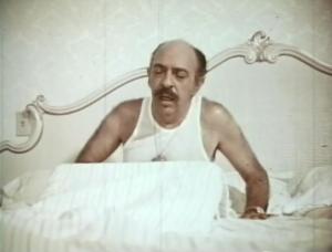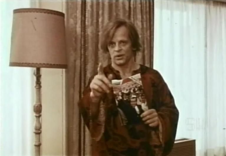 Lynn is fuming now and is letting Sam know this by throwing magazines and books at him as he tries to dodge them – hard work when you’re wearing yet another kaftan; this one’s red. Lynn tells Sam he’s a pimp; as if he didn’t know. And then things get worse when she discovers that he has lost all their money ($20,000) on a “sure winner” called Lightning Bolt.