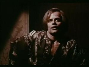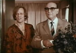 But what is Klaus up to? Black and white shirt with ruffled cuffs – check. Bug eye glasses – check. Open shirt – check. Hairy chest out – check. He’s got it all. He looks like a human fly. And he’s being cheeky with Barbi Benton; he flicks her hair out of the way and starts undoing the front zipper on her dress. Tut, tut!